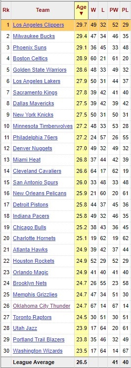 4月13日讯 本赛季,奇才阵容的平均年龄为23.5岁,是NBA30支球队中最年轻的球队,快船则以29.7岁的平均年龄,成为联盟中的最老球队,详情如下: