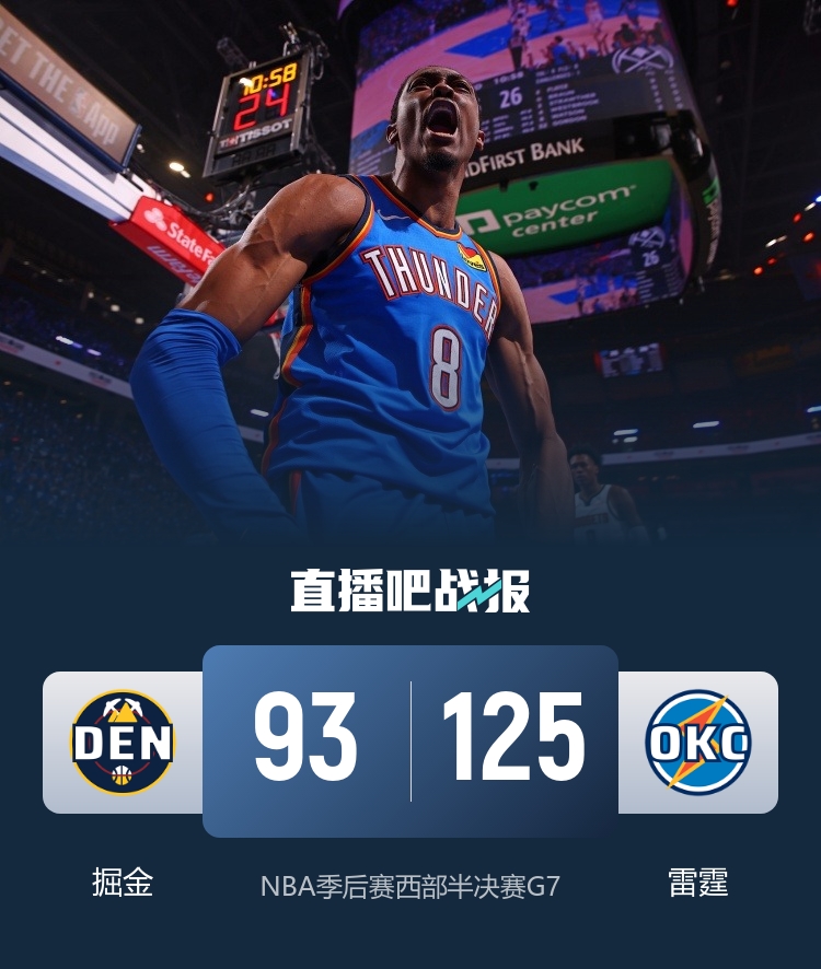 比赛开始,双方开场短暂相持,掘金连投带罚取得两位数,威少连续失误但也命中三分,雷霆轰出13-0强势反超,戈登三分破荒,两队再度陷入缠斗,杰伦-威廉姆斯持续输出,单节爆砍17分带队确立两位数优势,半场战罢雷霆60-46领先掘金。易边再战,雷霆攻防两端压制掘金,一举将分差拉开到20分以上,约基奇三分苦苦支撑,末节雷霆越战越勇将分差拉开到30分以上,掘金换下主力投子认负。最终,雷霆125-93大胜掘金,总比分4-3挺进西决。