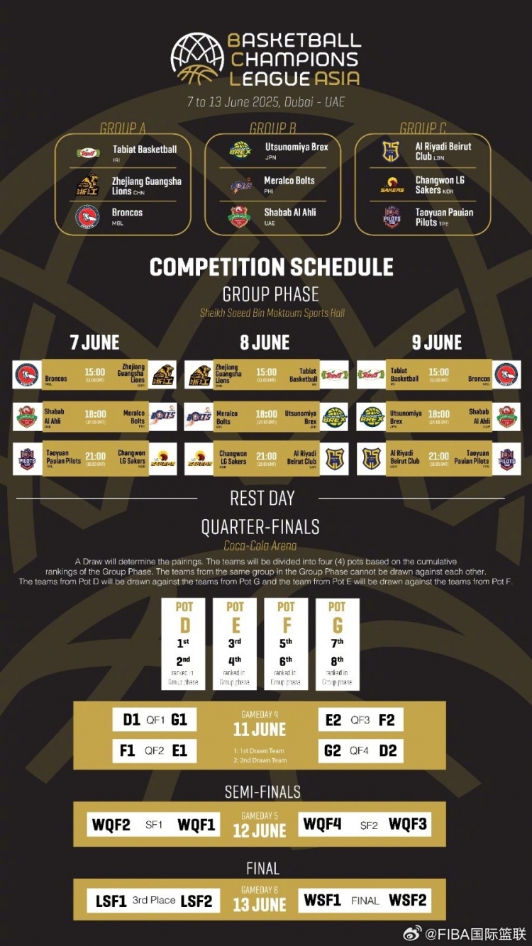 6月1日讯 2025FIBA亚洲篮球冠军联赛详细赛程出炉,浙江广厦将在北京时间6月7日与8日19点出战小组赛。