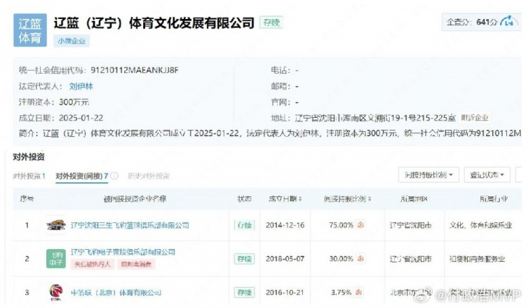 之所以给辽篮变更实控人,并通过叠床架屋的复杂股权关联来操作,大概率是因为辽篮(沈阳)体育这个公司壳也陷入了债务危机,只能重新注册一个新的壳子,即辽篮(辽宁)体育,试图暂时保住辽篮的股权。此前,四川金强男篮就用这种方式变更了注册主体,从四川金强男篮更名为四川锦城蓝鲸男篮,而锦城蓝鲸的实控人从成都金强公司变更成四川三一三艺文化发展有限公司,而锦城蓝鲸的小股东、法人赖翌蓼则是金强少主周冰晗的夫人。