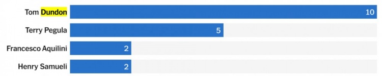 卡罗来纳飓风队老板汤姆-邓顿在这一类别中遥遥领先——考虑到他所执掌的球队在赛场上取得了相对不错的成绩,这样的结果可能会让不少人感到有些惊讶。