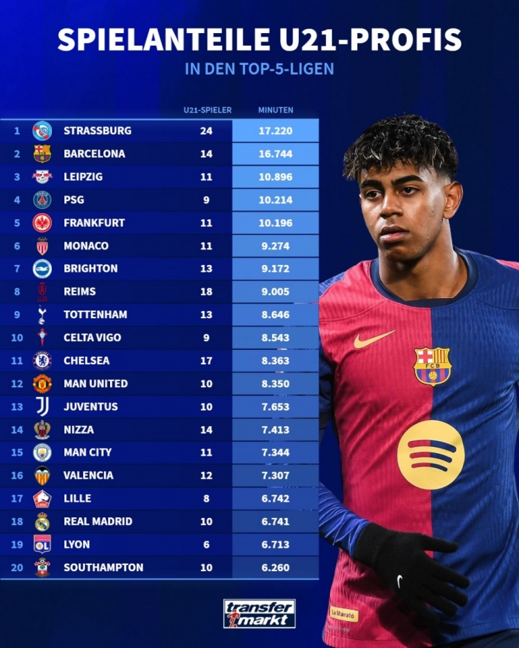 3月29日讯 德国转会市场统计了本赛季五大联赛球队U21球员的出场时间,并列出排名,斯特拉斯堡居首,巴萨、莱比锡排名二三位。