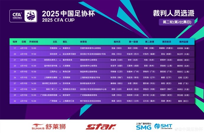 4月19日讯 中国足协杯官方公布第二轮第2比赛日裁判安排,张超执法无锡吴钩vs南通支云,郭翔执法深圳二零二八vs陕西联合,马腾执法广州蒲公英vs南京城市。
