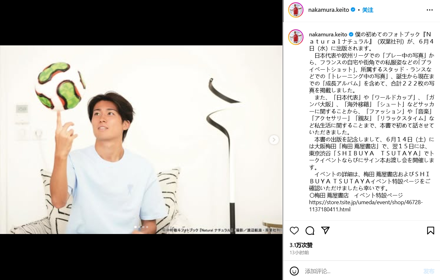中村敬斗社媒:我的首本写真集《Natural 自然》将于6月4日正式发行。这本写真集收录了222张照片,包括日本国家队及俱乐部比赛的赛场瞬间、在法国生活的私服造型、效力于兰斯期间的训练花絮,以及从小到大的成长相册。