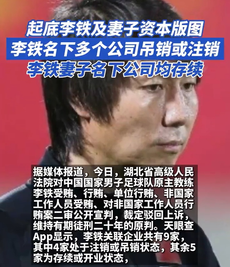 湖北省高级人民法院对中国国家男子足球队原主教练李铁受贿、行贿、单位行贿、非国家工作人员受贿、对非国家工作人员行贿案二审公开宣判,裁定驳回上诉,维持原判。