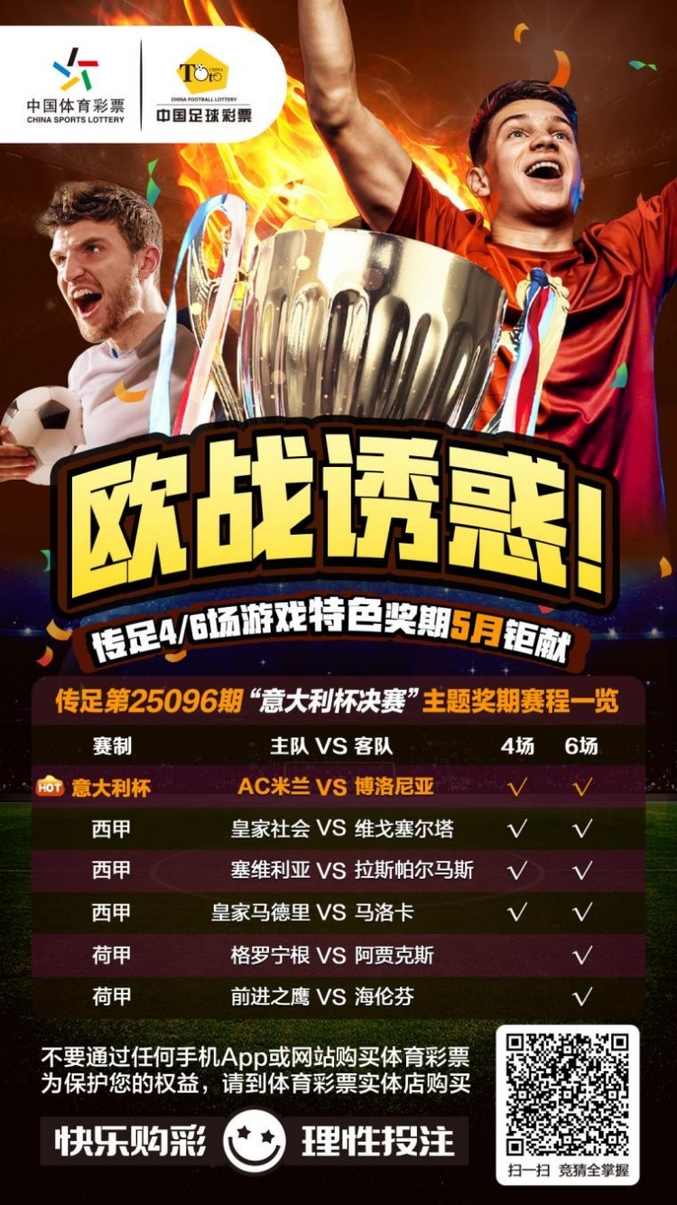 第25096期传足4/6场游戏特色奖期已经于2025年5月11日20:00开售,将于2025年5月13日22:00停售,并于5月15日开奖,其中AC米兰VS博洛尼亚、皇家社会VS维戈塞尔塔、塞维利亚VS拉斯帕尔马斯、皇家马德里VS马洛卡为4场进球游戏竞猜赛事。