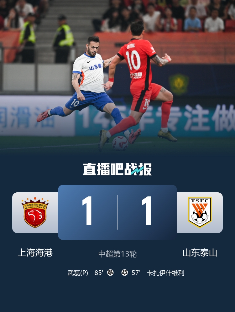 全场比赛结束,上海海港主场1-1战平山东泰山。