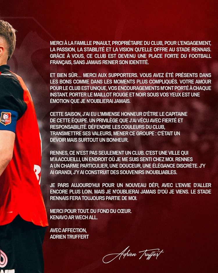 特鲁弗特在告别信中写道:“有些篇章在翻过去时充满情感,心头紧缩,但又满怀感恩。今天就是这样的情况。在雷恩度过了十年之后,我即将翻过人生中重要的一页。