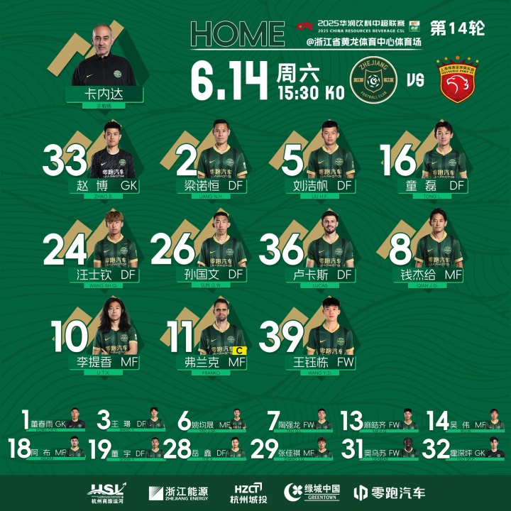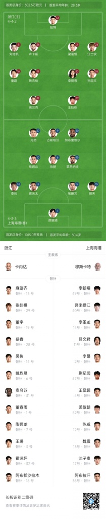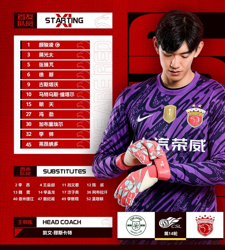 06月14日讯 中超第14轮浙江vs上海海港今日15:30进行,两队公布首发阵容,2外援vs4外援,武磊伤缺。