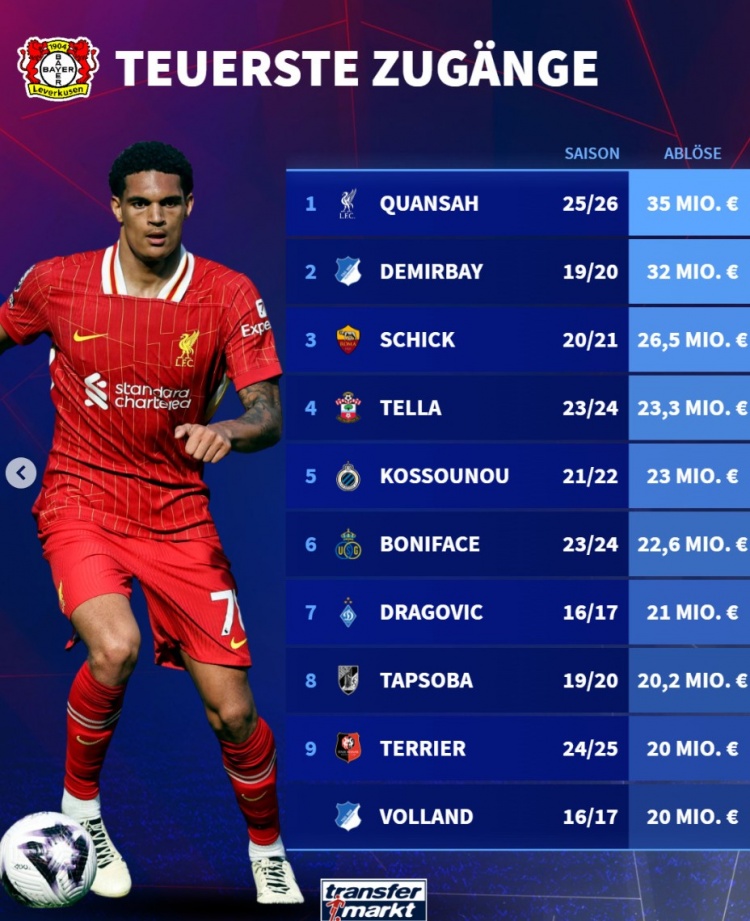 7月3日讯 利物浦中卫宽萨已经官宣转会勒沃库森,《转会市场》统计显示他也是药厂队史标王。