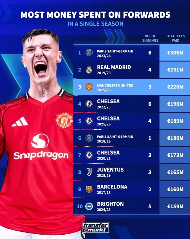 8月11日讯 德转统计了单一赛季锋线引援费用榜单,曼联今夏花2.26亿欧引进3人排在第三位,巴黎、皇马前二。