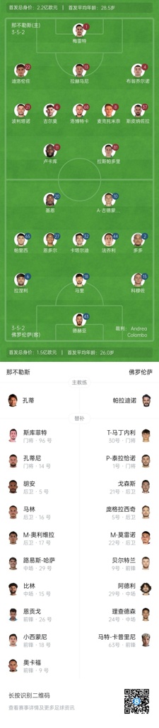 那不勒斯首发:1-梅雷特、37-斯皮纳佐拉、4-布翁乔尔诺、13-拉赫马尼、22-迪洛伦佐、6-吉尔莫、8-麦克托米奈、68-洛博特卡、21-波利塔诺、81-拉斯帕多里、11-卢卡库