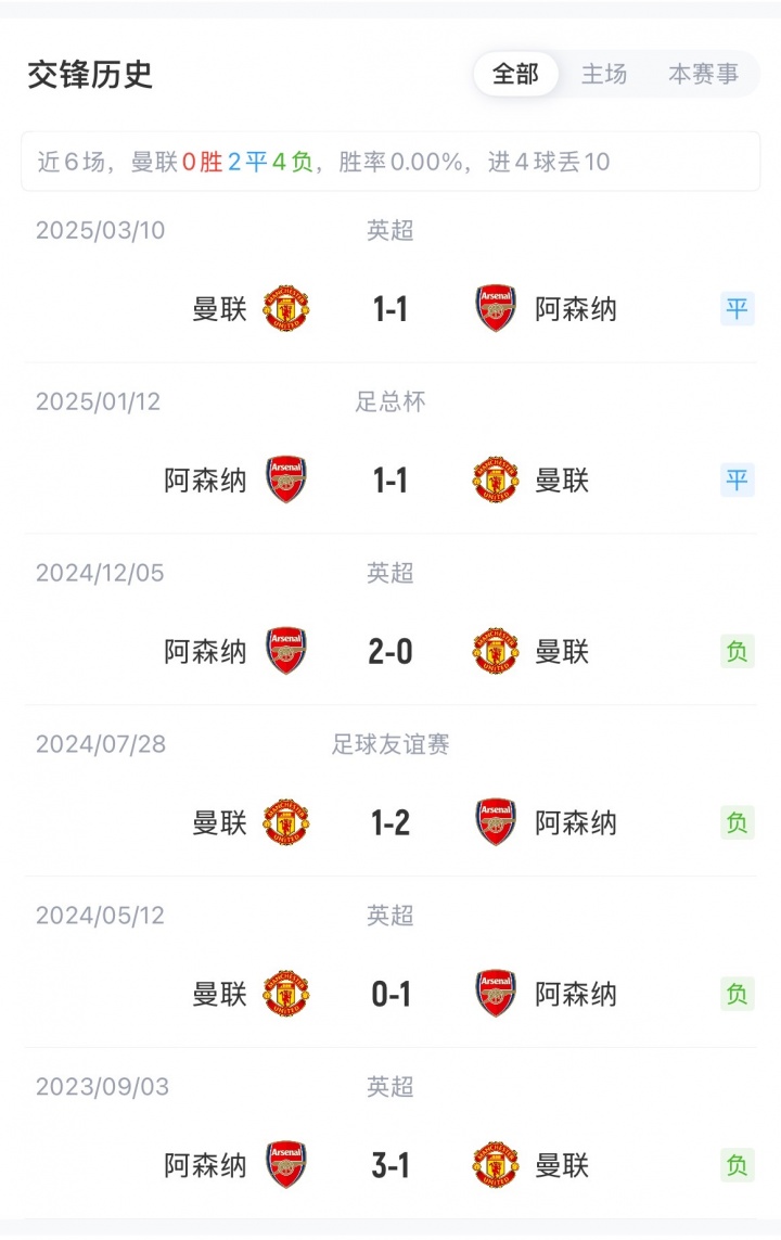 曼联最近18场英超主场对阵阿森纳输了两场(10胜6平),两场比赛都是阿尔特塔执教阿森纳时期(2020年11月和2024年5月,比分均为0-1)。