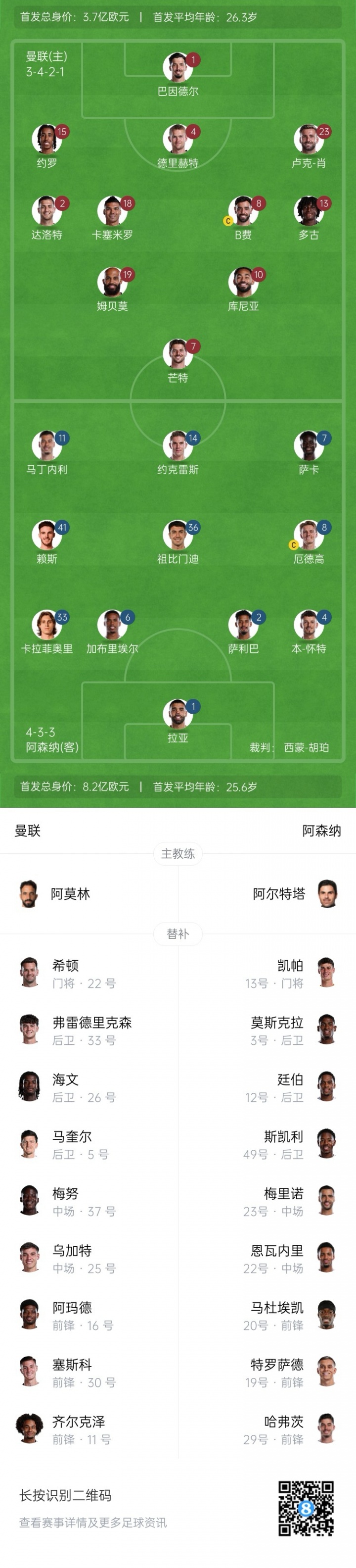 曼联替补:22-希顿、5-马奎尔、26-海文、33-弗雷德里克森、25-乌加特、37-梅努、11-齐尔克泽、16-阿玛德、30-塞斯科