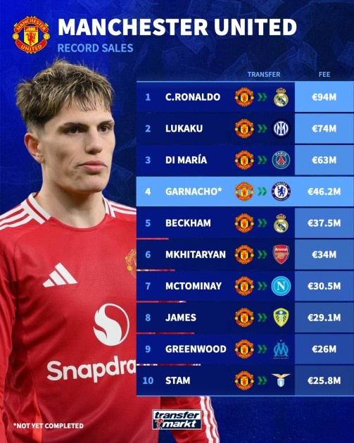 德转晒出曼联出球球员收入的排行榜,加纳乔以4620万欧元转会费成为曼联队史售价第四高的球员。超越了2003年贝克汉姆加盟皇家马德里时的3750万欧元。C罗2009年以9400万欧元转会皇马仍是曼联队史最高售价纪录,德转表示,短期内极有可能无人能超越。