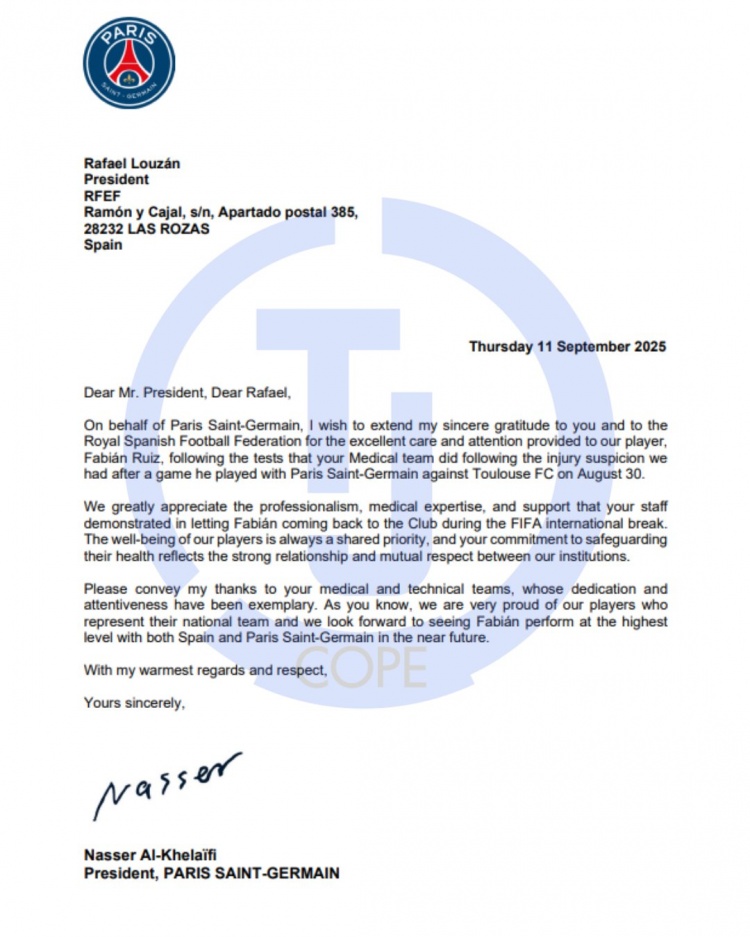 信中写道:“尊敬的主席先生,亲爱的拉斐尔:我谨代表巴黎圣日耳曼俱乐部,向您以及西班牙皇家足球协会致以诚挚的感谢,感谢您们对我俱乐部球员法比安-鲁伊斯的细心照料和周到关怀。此前,在我们怀疑法比安在8月30日对阵图卢兹的比赛中受伤后,贵方医疗团队对他进行了检查。”