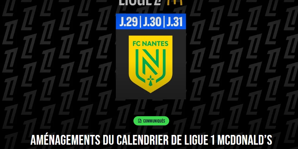 LFP董事会因此决定,将法甲联赛第29轮——南特足球俱乐部对阵巴黎圣日耳曼,定于2025年4月22日星期二举行。