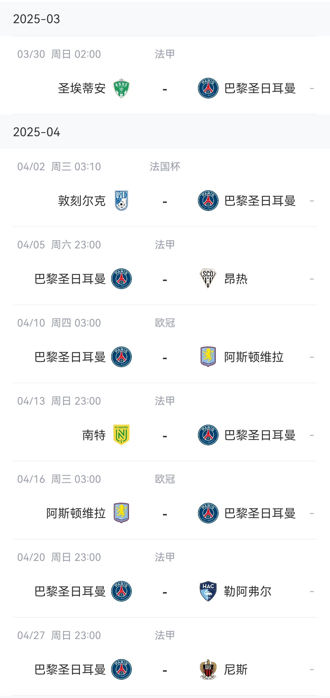 以下为巴黎原地的赛程表,可以看到4月13日巴黎客战南特的比赛正好夹在欧冠1/4决赛巴黎vs维拉的两回合之间,这场比赛改期后,巴黎将在首回合主场对阵维拉后,心无旁骛地备战次回合客战维拉的比赛。