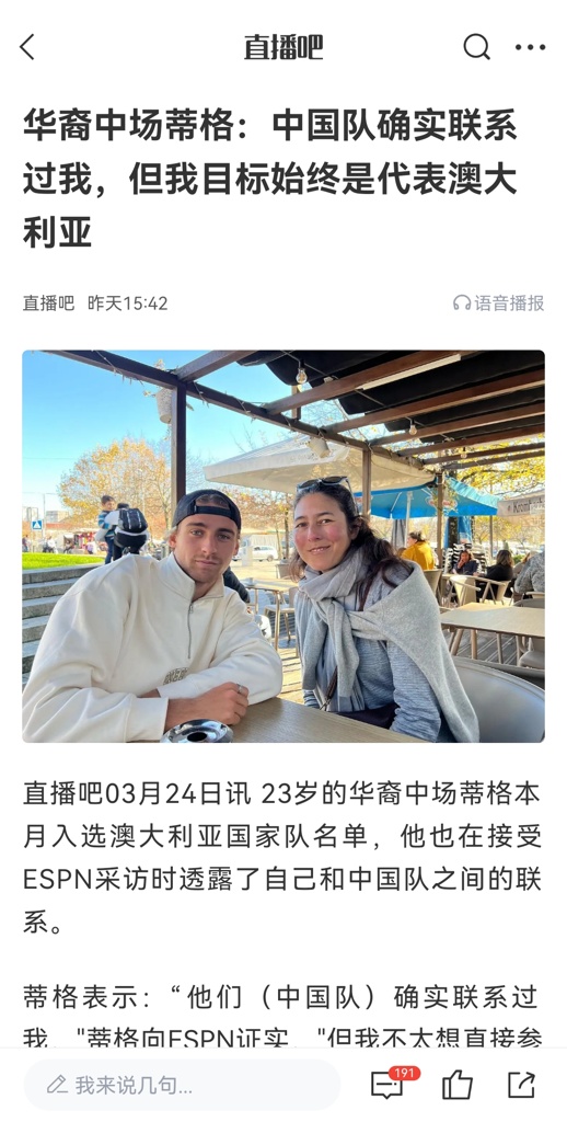 在本月首次入选澳大利亚名单后,蒂格表示:“他们(中国队)确实联系过我,"蒂格向ESPN证实,"但我不太想直接参与这类谈判,所以我把相关事宜转交给了我的经纪人处理。不过从我足球生涯起步之初,我就明确表示过自己的目标始终是代表澳大利亚国家队出战。